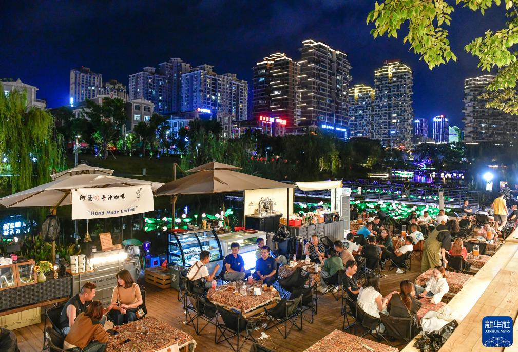 9月14日,游客和市民在興義市馬嶺河夜間消費聚集區休閑。