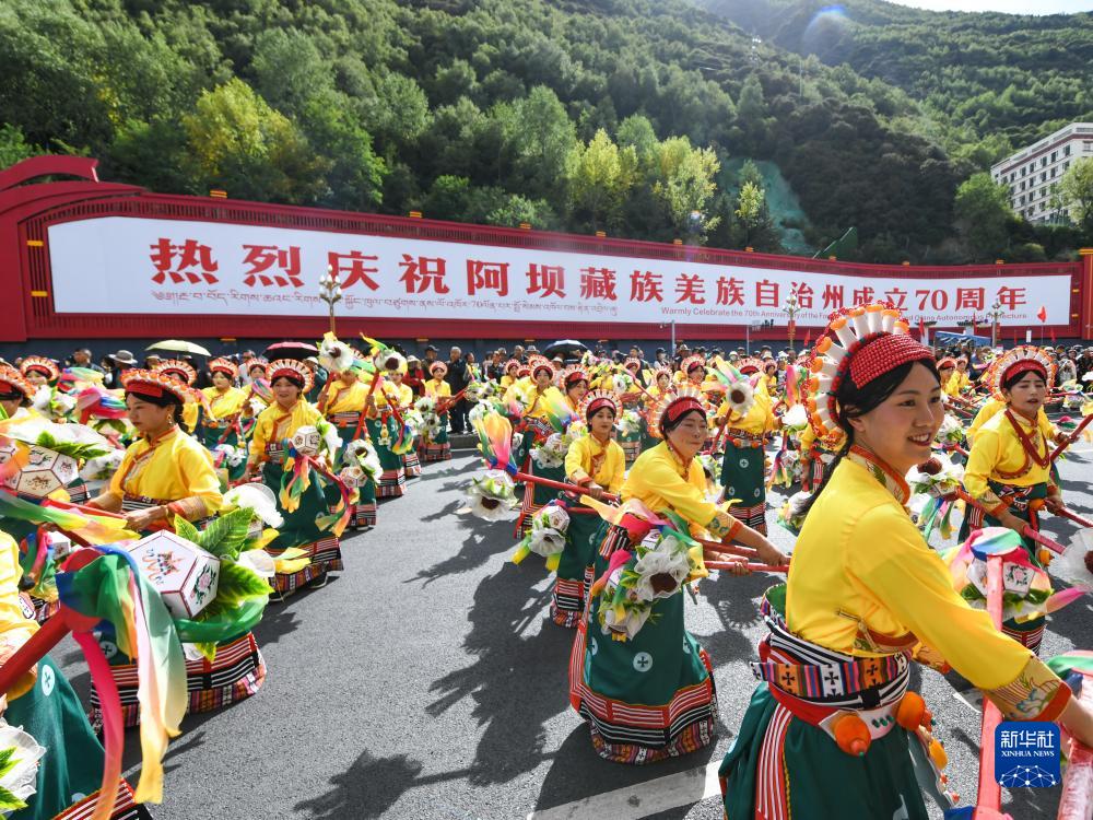 當日,來自四川省阿壩藏族羌族自治州13個縣市的近千名演員在馬爾康市街頭開展巡游活動,展示阿壩州各個地區的非遺文化。據了解,非遺展演是阿壩州成立70周年系列慶?;顒又?。同時,當地還開展非遺集市、非遺晚會等活動。