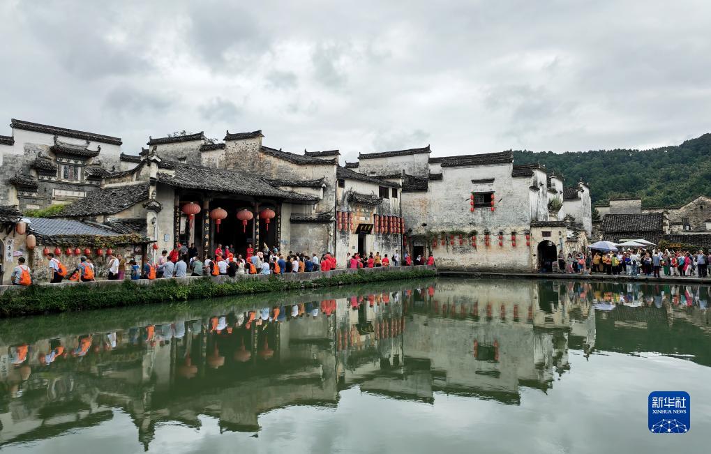 這是游客們在黃山市黟縣宏村內游覽(9月13日攝)。