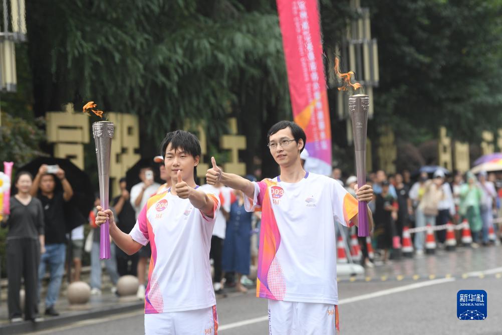 9月16日,火炬手溫從發(右)和彭云飛在火炬傳遞中。