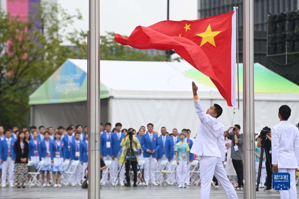 當日,杭州亞運會亞運村開村儀式暨中國體育代表團歡迎儀式在亞運村旗幟廣場舉行。