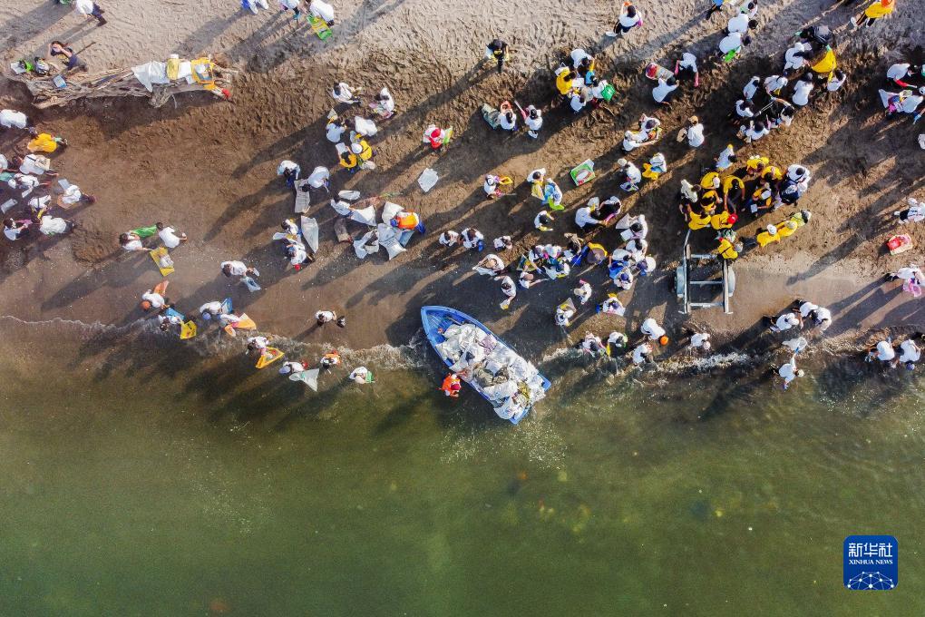 9月16日,志愿者在菲律賓馬尼拉灣舉辦的“國際海岸清理日”活動上清理垃圾(航拍照片)。