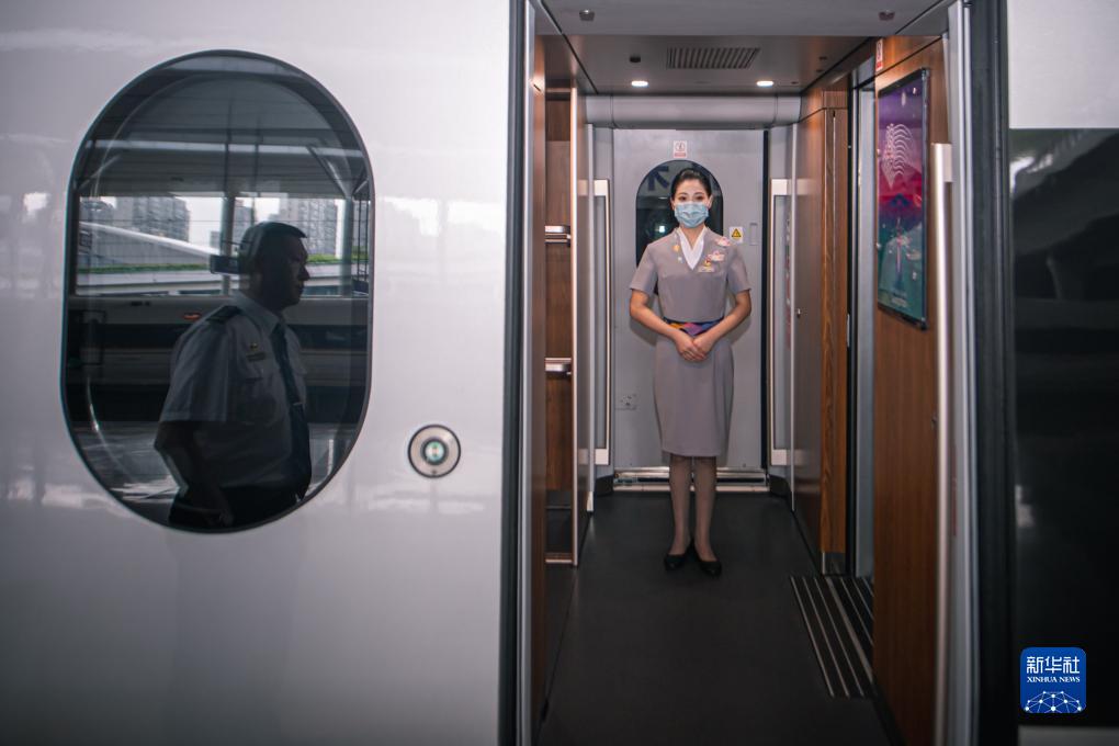 9月16日,在杭州東站,乘務員在復興號亞運智能動車組列車上準備迎接乘客。