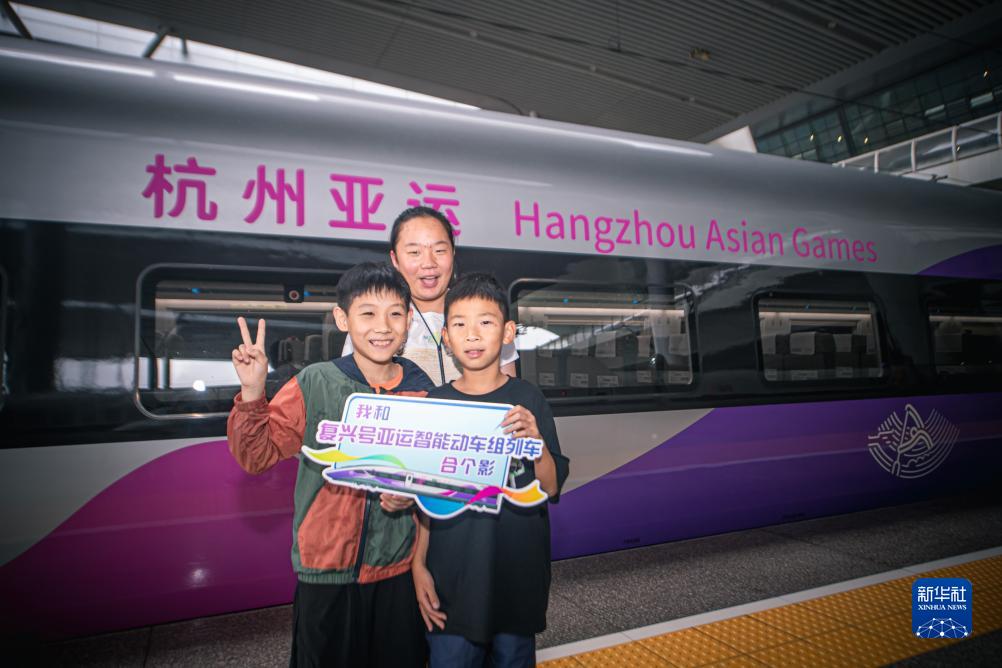 9月16日,在杭州東站站臺,小乘客們與復興號亞運智能動車組列車合影留念。