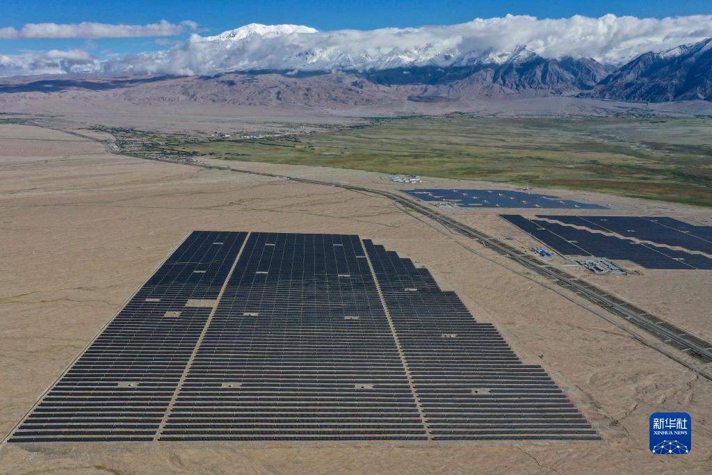 在新疆塔什庫爾干塔吉克自治縣塔合曼鄉拍攝的一處大型光伏發電項目(8月27日攝)。