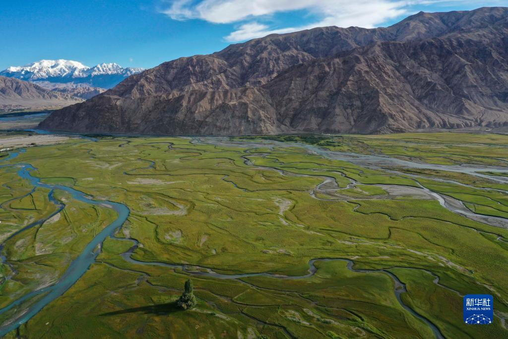 新疆塔什庫爾干塔吉克自治縣金草灘濕地景觀(8月28日攝,無人機照片)。