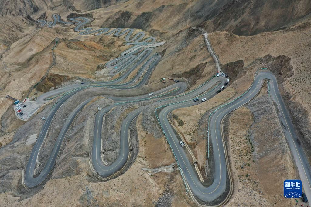 在新疆塔什庫爾干塔吉克自治縣,游客駕車穿行在“盤龍古道”景區(8月27日攝,無人機照片)。