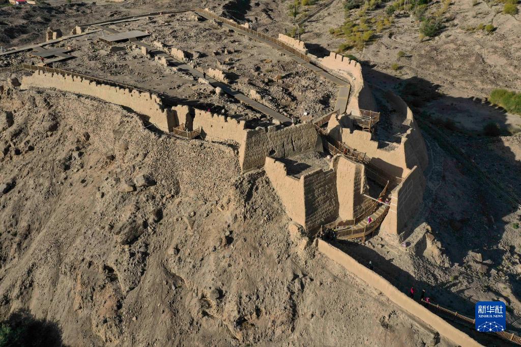 游客在新疆塔什庫爾干塔吉克自治縣石頭城遺址游玩(8月28日攝,無人機照片)。