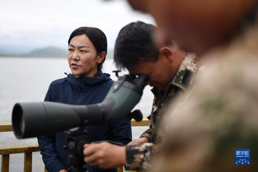 甘肅尕海則岔國家級自然保護區管護中心尕海保護站站長香毛吉(左一)和同事在保護區內用望遠鏡觀測野生動物(7月7日攝)。