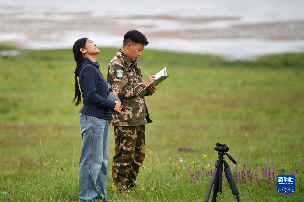 甘肅尕海則岔國家級自然保護區管護中心尕海保護站站長香毛吉(左)和同事在巡護過程中做記錄(7月7日攝)。