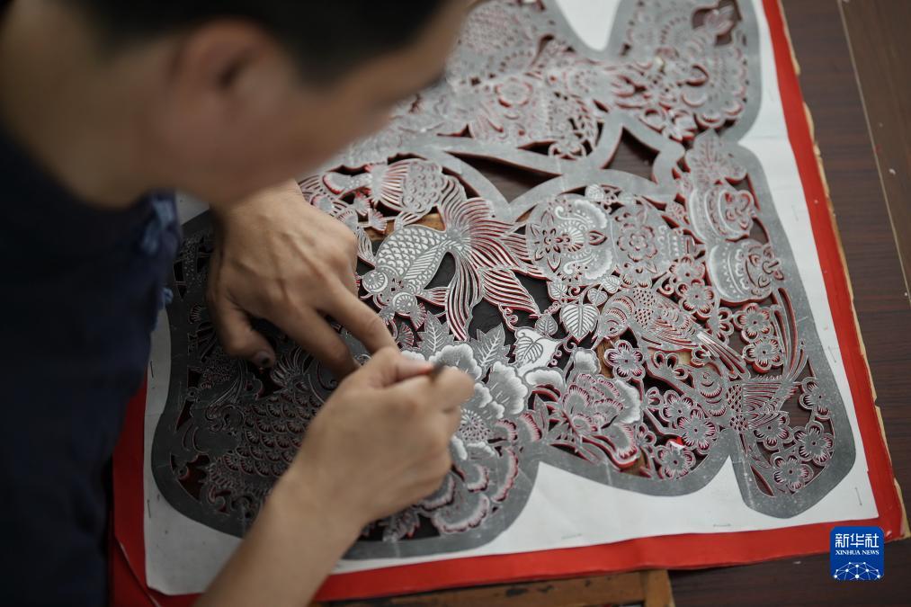 9月16日,剪紙藝人在玉田縣“非遺會客廳”工作室內創作“?!弊旨艏堊髌?。