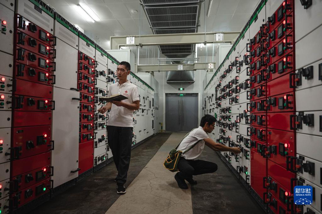 9月11日,中方技術服務組成員在埃塞俄比亞首都亞的斯亞貝巴非洲疾控中心總部大樓內進行電路檢修。