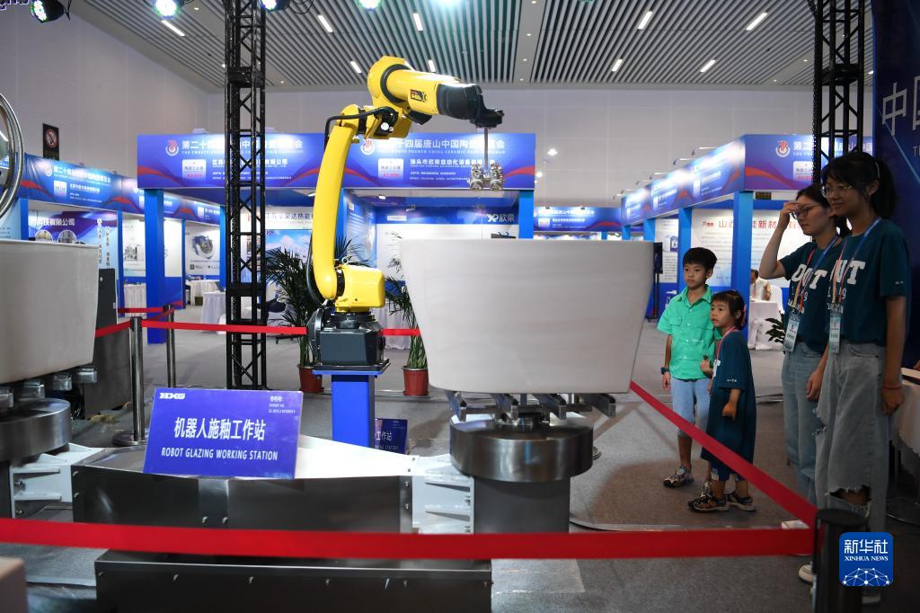 9月16日,參觀者在第二十四屆唐山中國陶瓷博覽會現場參觀一款機器人施釉工作站。
