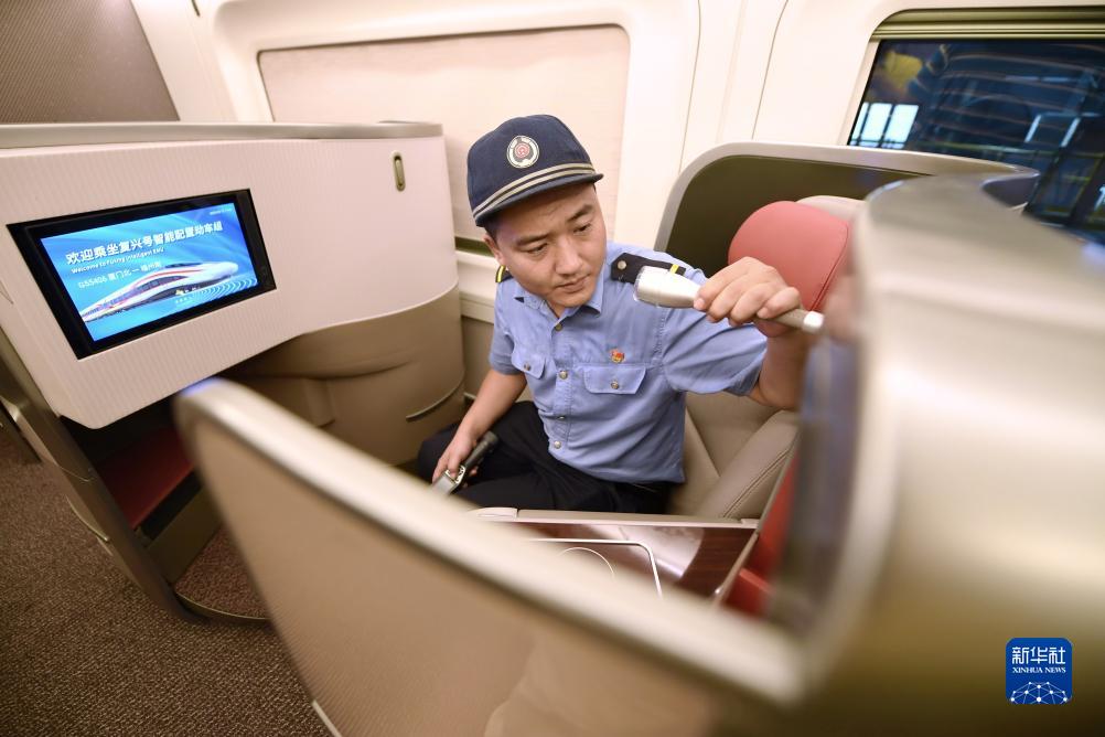 9月13日,高春成在復興號智能配置動車組商務艙內檢查設備。