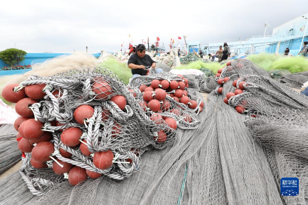 9月16日,漁民在江蘇省鹽城市射陽縣黃沙港國家中心漁港整理漁具。