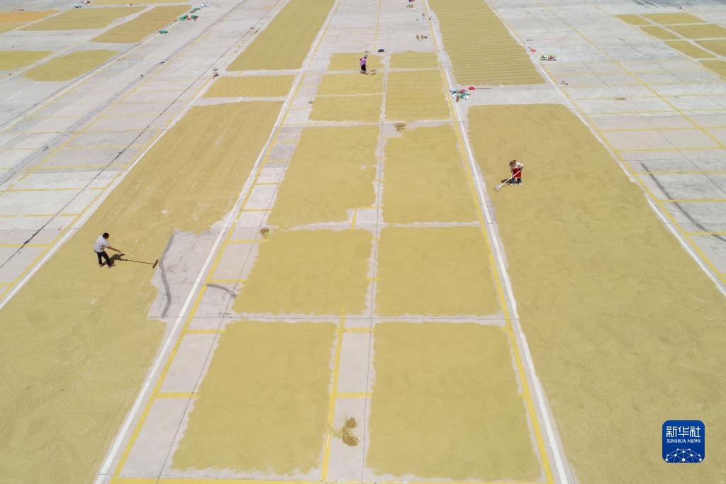 9月16日,村民在貴州省黔東南苗族侗族自治州丹寨縣金泉街道晾曬稻谷(無人機照片)。
