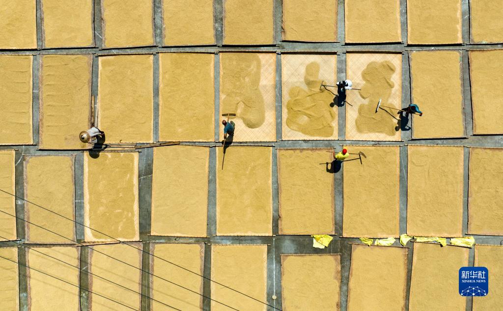 金秋時節,各地農民抓住晴好天氣晾曬收獲的高粱、水稻、玉米等糧食作物,呈現多彩的豐收圖景。