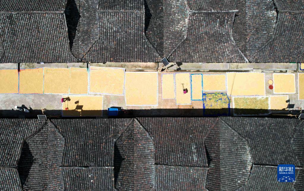 9月16日,在貴州省黔東南苗族侗族自治州從江縣加勉鄉污扣村,村民在晾曬稻谷(無人機照片)。