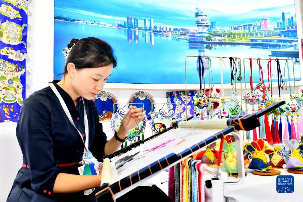 9月16日,在山東國際會展中心,日照市刺繡非遺傳承人李兆梅現場展示刺繡技藝。