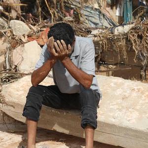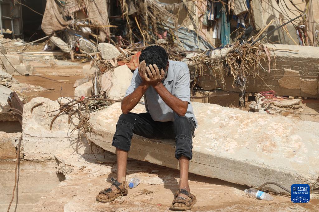 9月15日,在利比亞東部城市德爾納, 一名男子坐在被洪水催毀的房子前。