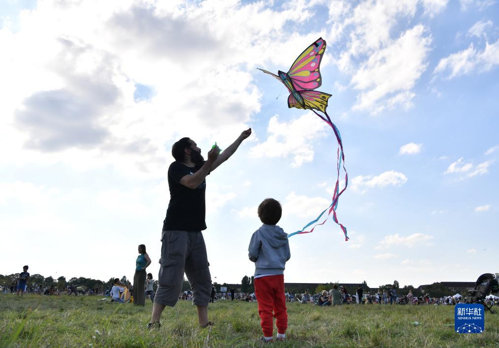 9月16日,在德國柏林,一名男子和孩子一起放風箏。