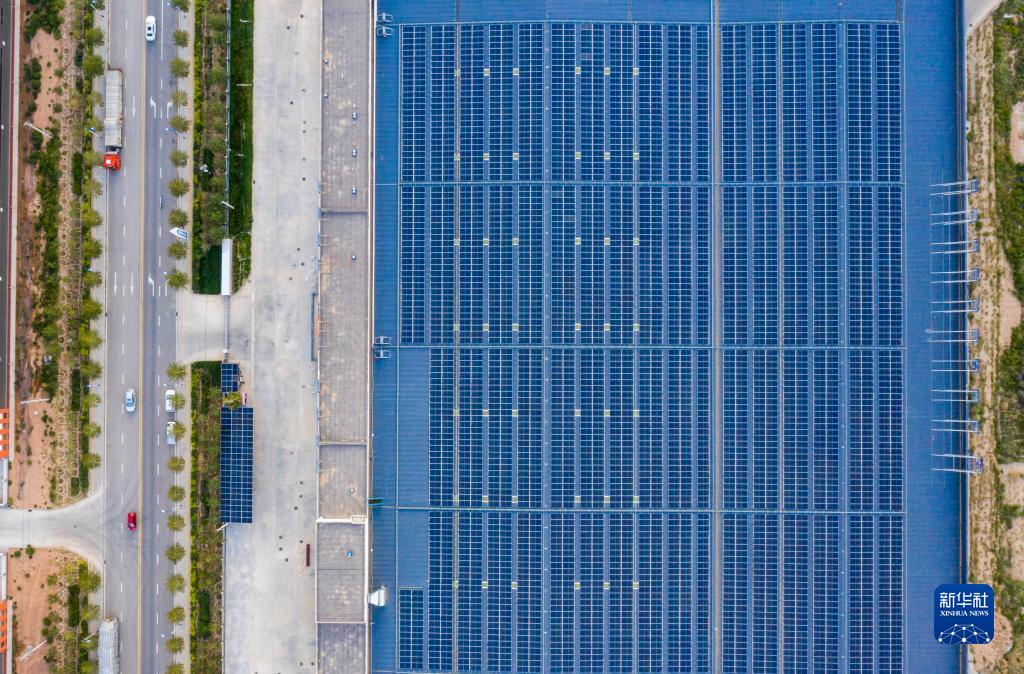 這是9月15日拍攝的位于寧夏吳忠市同心縣的清潔能源產業園內某企業屋頂已并網發電的光伏板(無人機照片)。