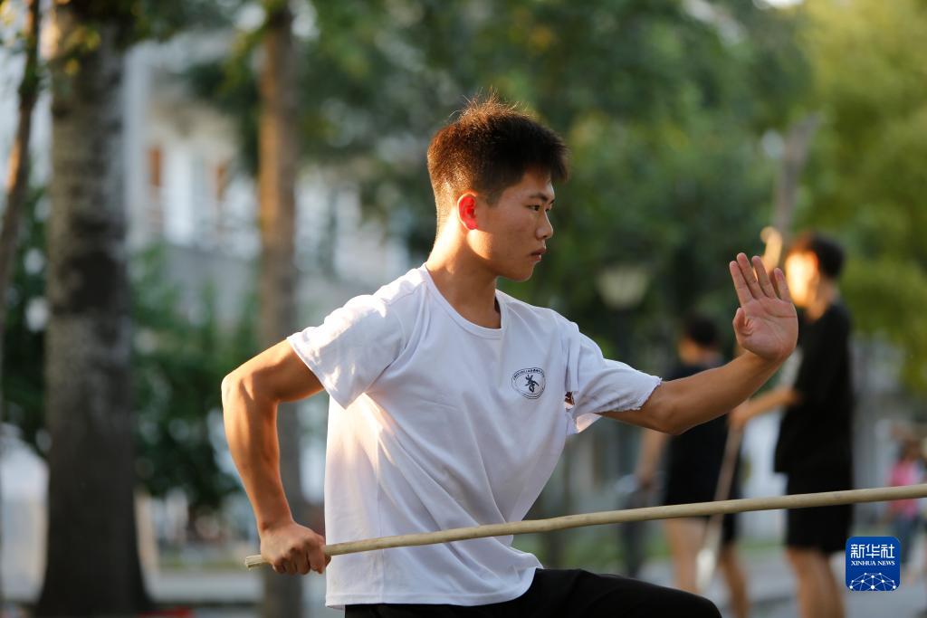 9月14日,河南溫縣陳家溝一家武術學校的學員在戶外練功。