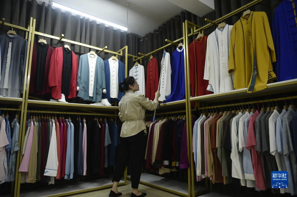 9月15日,河南溫縣陳家溝一家服裝生產企業的工作人員在展廳整理太極練功服。