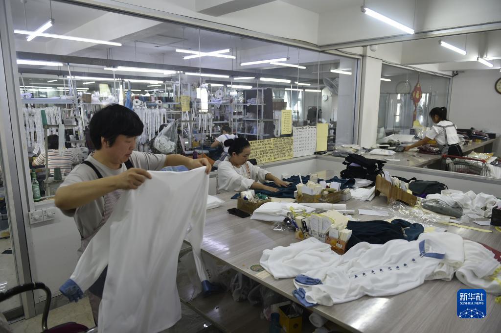 9月15日,河南溫縣陳家溝一家服裝生產企業的工作人員在車間制作太極練功服。