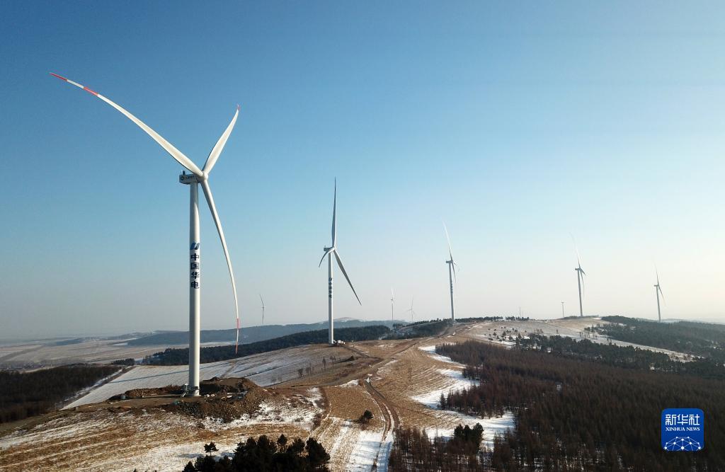 這是華電黑龍江區域哈爾濱依蘭雞冠山風電場三期工程部分運行的風電機組(2023年2月7日攝,無人機照片)。