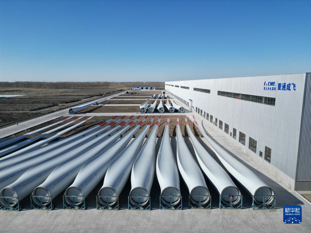 吉林重通成飛新材料股份公司大安公司生產的風機葉片(2023年3月8日攝,無人機照片)。