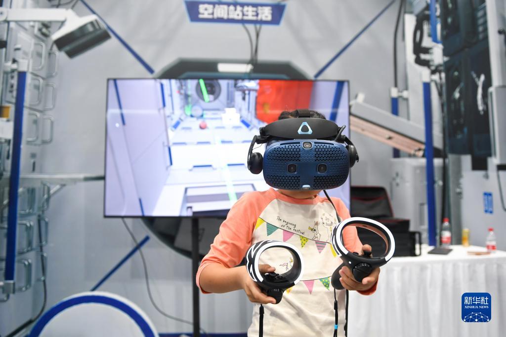 9月17日,在全國科普日北京主場活動展區,小朋友使用虛擬現實設備感受天和核心艙內的生活。