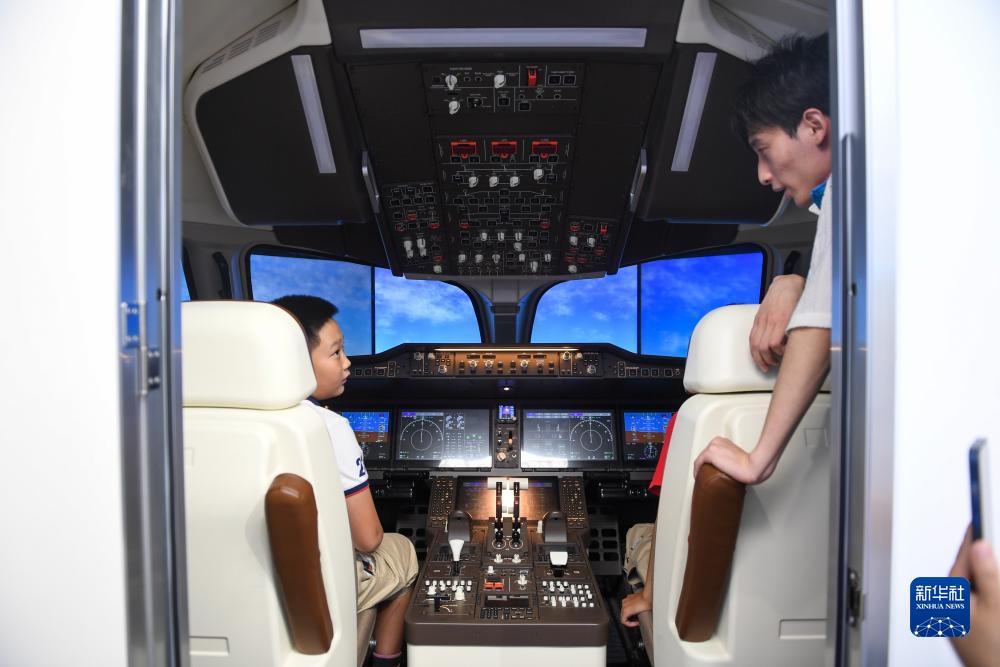 9月17日,在全國科普日北京主場活動展區,兩名小朋友在體驗C919模擬駕駛器。