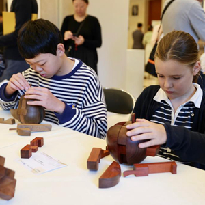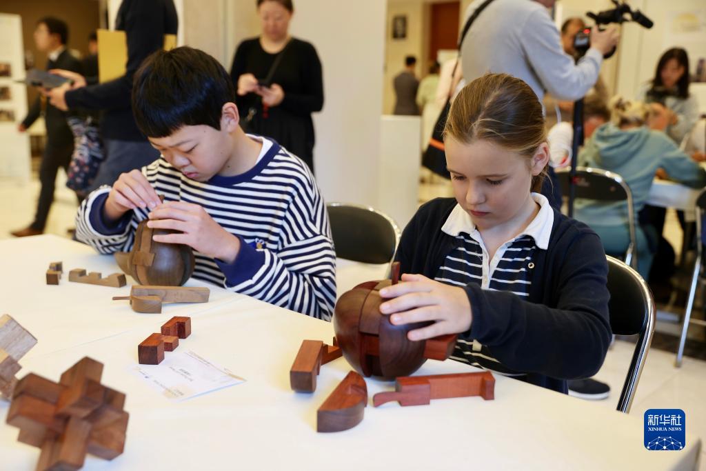 9月16日,小朋友在比利時布魯塞爾的中國使館開放日活動上體驗榫卯技藝。