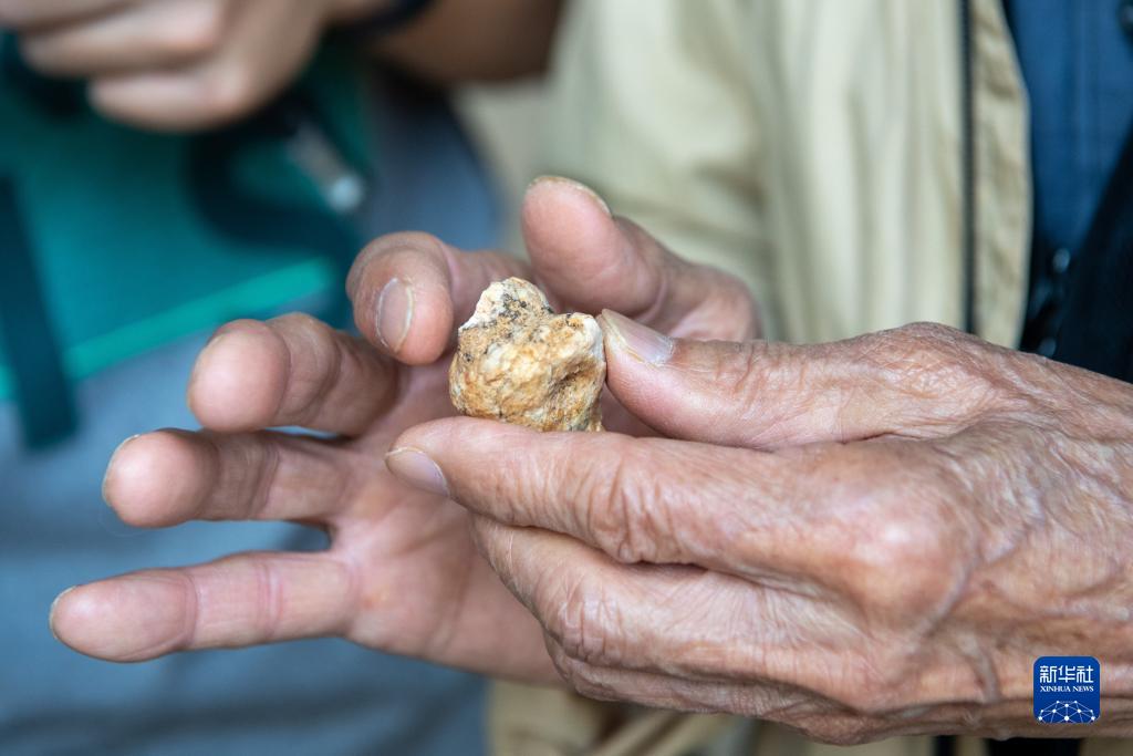 9月14日,黃萬波與考古發掘隊隊員在仔細觀察剛出土的化石。