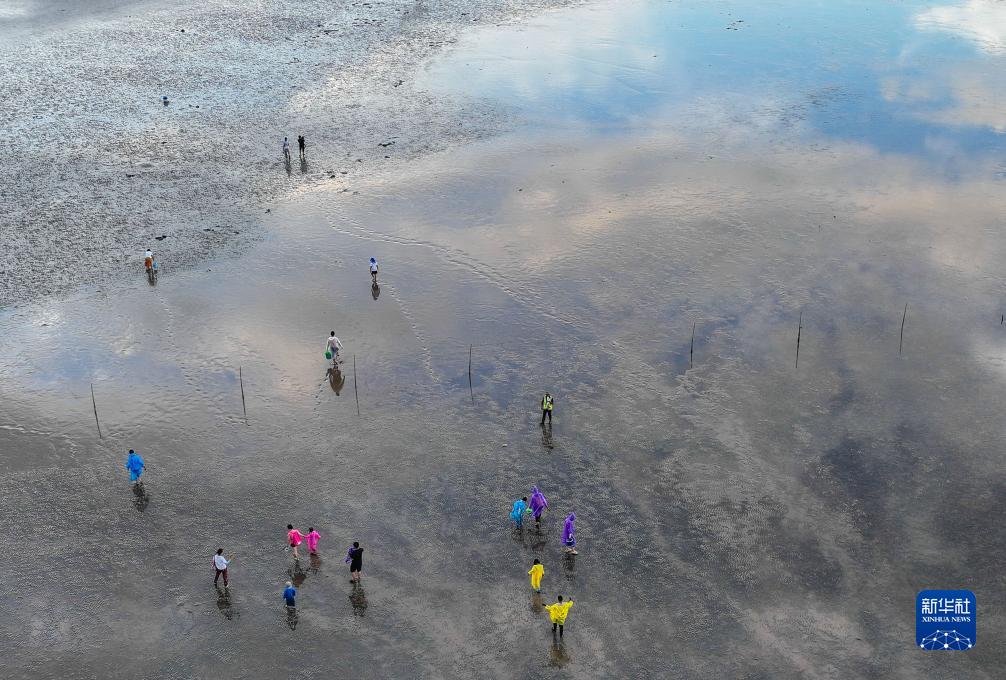 9月16日,游客在啟東“十里海灣”灘涂上游玩(無人機照片)。
