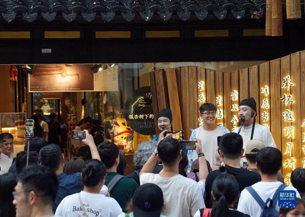 9月17日,在豫園商城,扮演李白、杜甫的演員邀請游客進行對詩和猜謎等互動游戲。