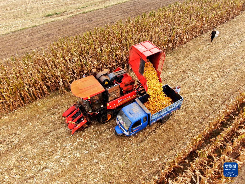 9月18日,在山東省臨沂市平邑縣卞橋鎮新橋村高標準農田里,農機手將收割的玉米裝車(無人機照片)。