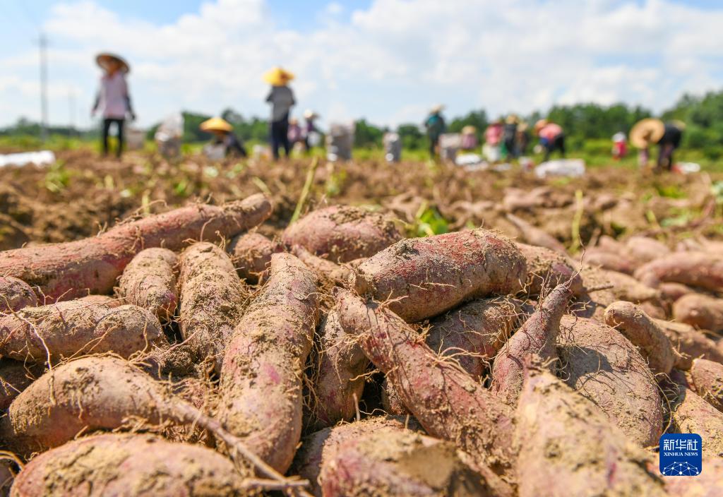 9月18日,在湖南省永州市道縣富塘街道大福社區,村民在收獲紅薯。