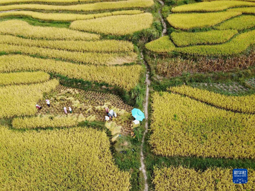 9月17日,在貴州省黔東南苗族侗族自治州施秉縣城關鎮下翁哨村,村民在收割水稻(無人機照片)。