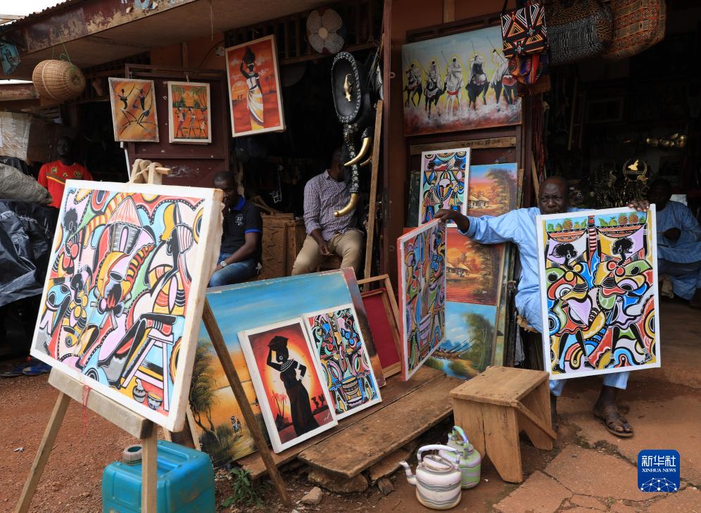 9月16日,在喀麥隆首都雅溫得手工藝品市場,商販在售賣繪畫作品。