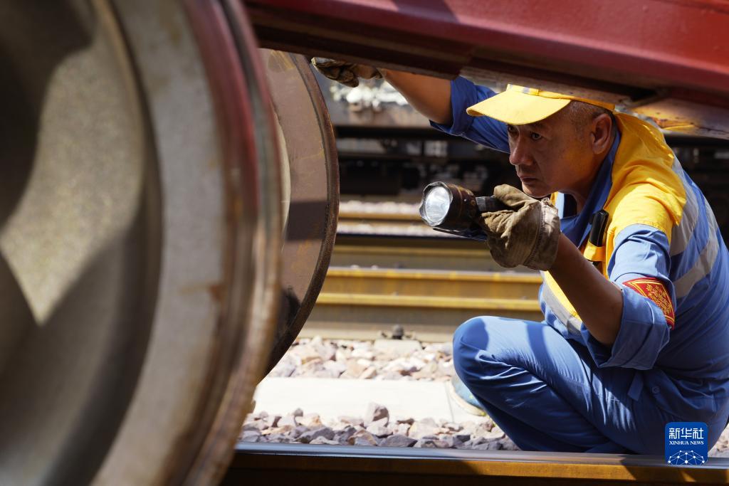 9月17日,中歐班列(鄭州)整備班組貨車檢車員在檢查脫軌自動制動裝置。