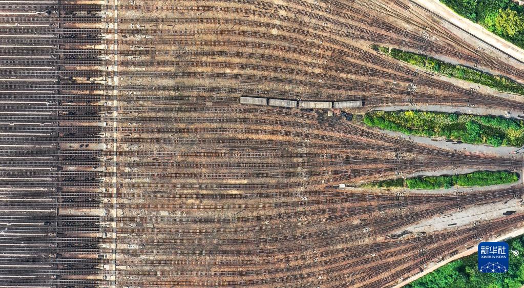 9月17日,在鄭州北站編組場,為中歐班列(鄭州)選扣好的空車底通過駝峰溜放至固定股道(無人機照片)。