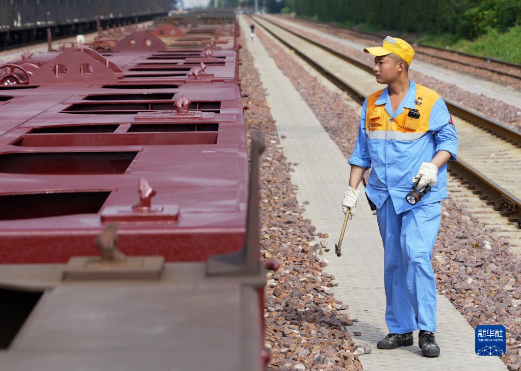 9月17日,中歐班列(鄭州)整備班組貨車檢車員在檢查車輛集裝箱鎖頭。