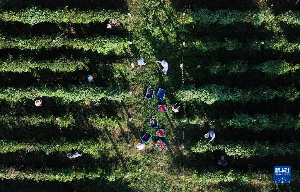 9月18日,唐山市豐潤區火石營鎮東高莊村的農民采摘五味子(無人機照片)。