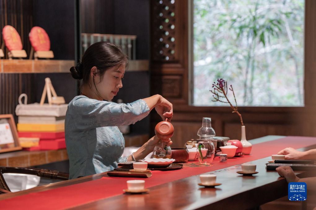在景邁山布朗公主茶廠,傣族姑娘葉香在給顧客泡茶(9月14日攝)。