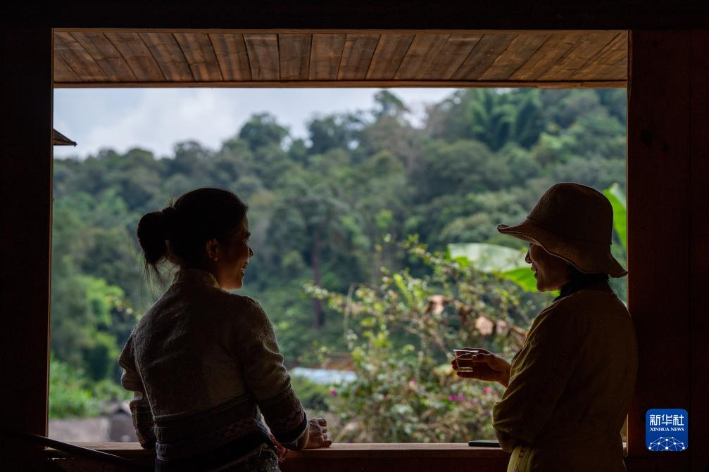 來自廣東的游客(右)在景邁山糯崗古寨傣族茶農家品嘗普洱茶(9月14日攝)。