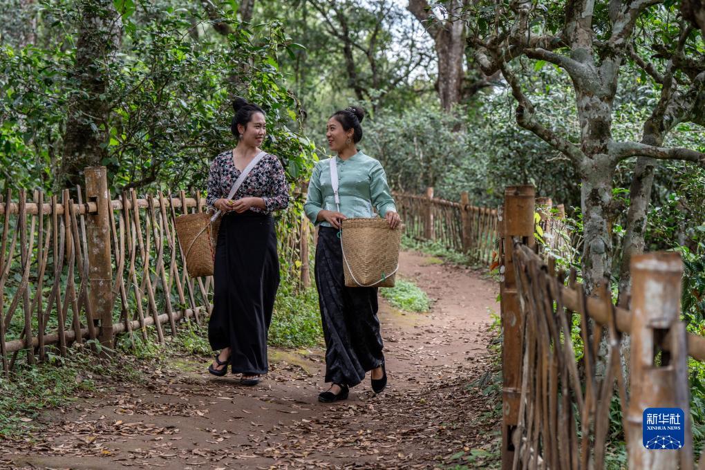 傣族姑娘玉兒菁(左)、月怕仙走在景邁山大平掌古茶林中(9月14日攝)。