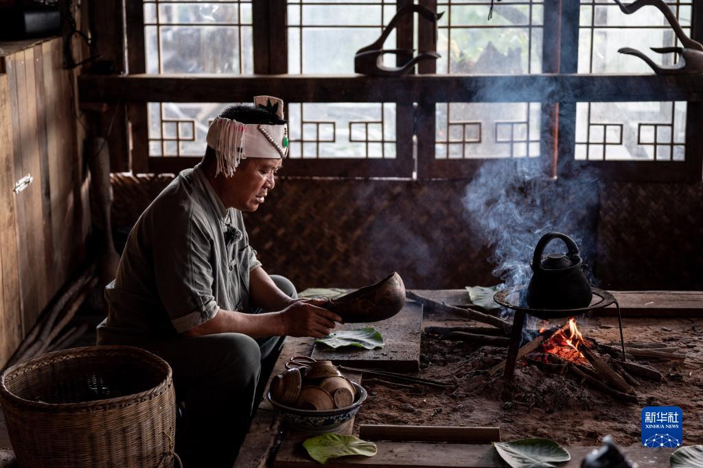 在景邁山芒景村,布朗族茶農南康在火塘邊做烤茶(9月14日攝)。