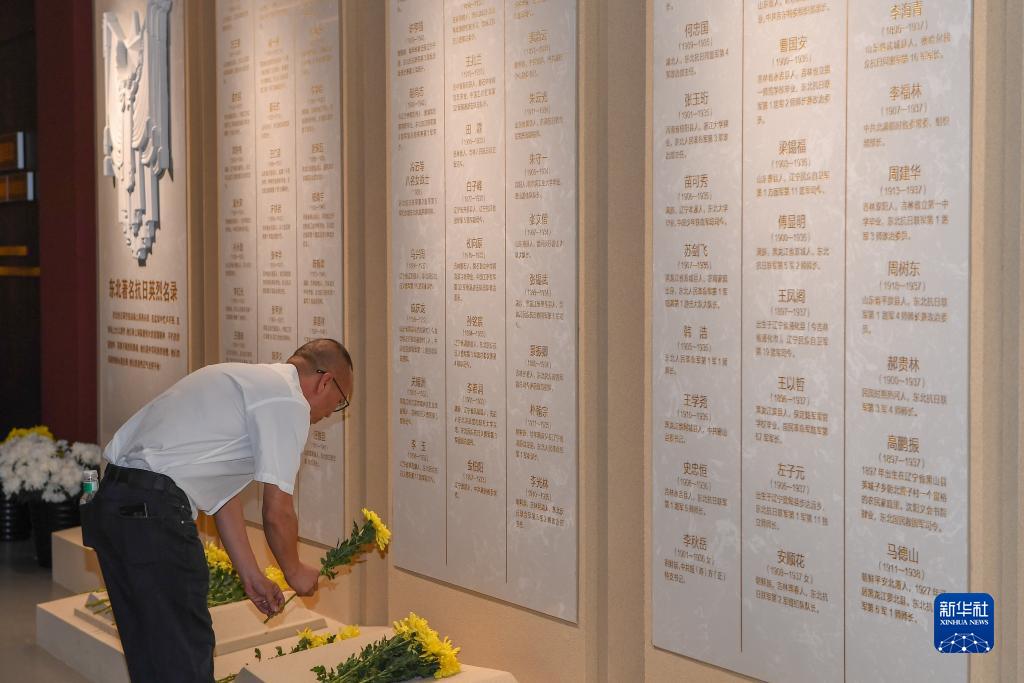 9月18日,在東北淪陷史陳列館,市民向革命先烈敬獻鮮花。